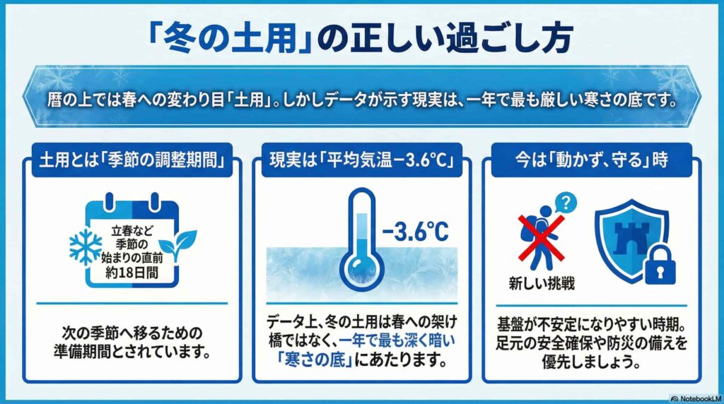 つまり、データの上では、冬の土用とは「冬から春への架け橋」ではなく、**「一年で最も深く、暗い寒さの底」**であることが証明されました。 今は決して無理をして動くべき時ではなく、じっと耐え忍ぶ時期だと言えるでしょう。
